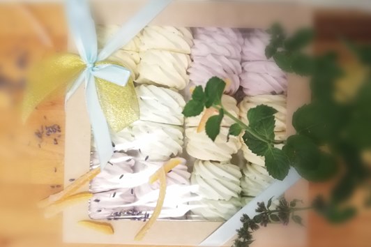 Три разных, но самых популярных вкуса в одной коробочке: зефир на апельсиновом соке с апельсиновыми цукатами; зефир лавандовый на лаванде с полуострова Тихань (озеро Балатон, Венгрия); мятный освежающий зефир с пастой мяты и мелиссы. Вес коробочки 420 г.