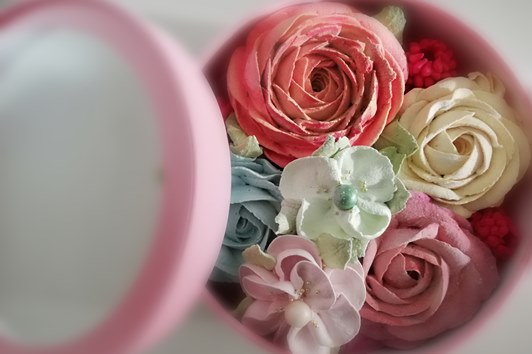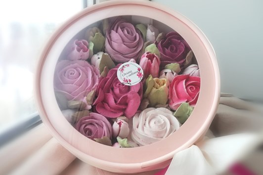 Нарядная шляпная коробочка с одним слоем зефирных цветов.