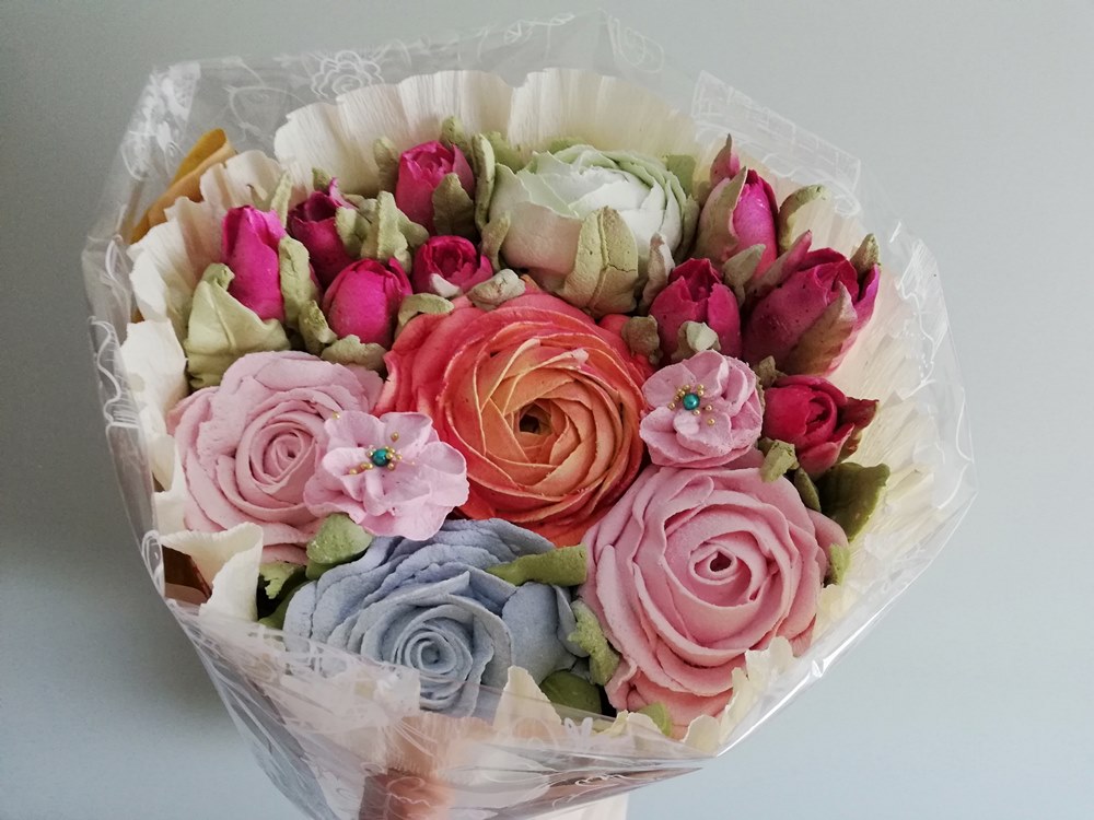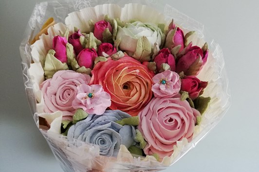 Яркий букет с летними розами. Диаметр основания 22-24 см.