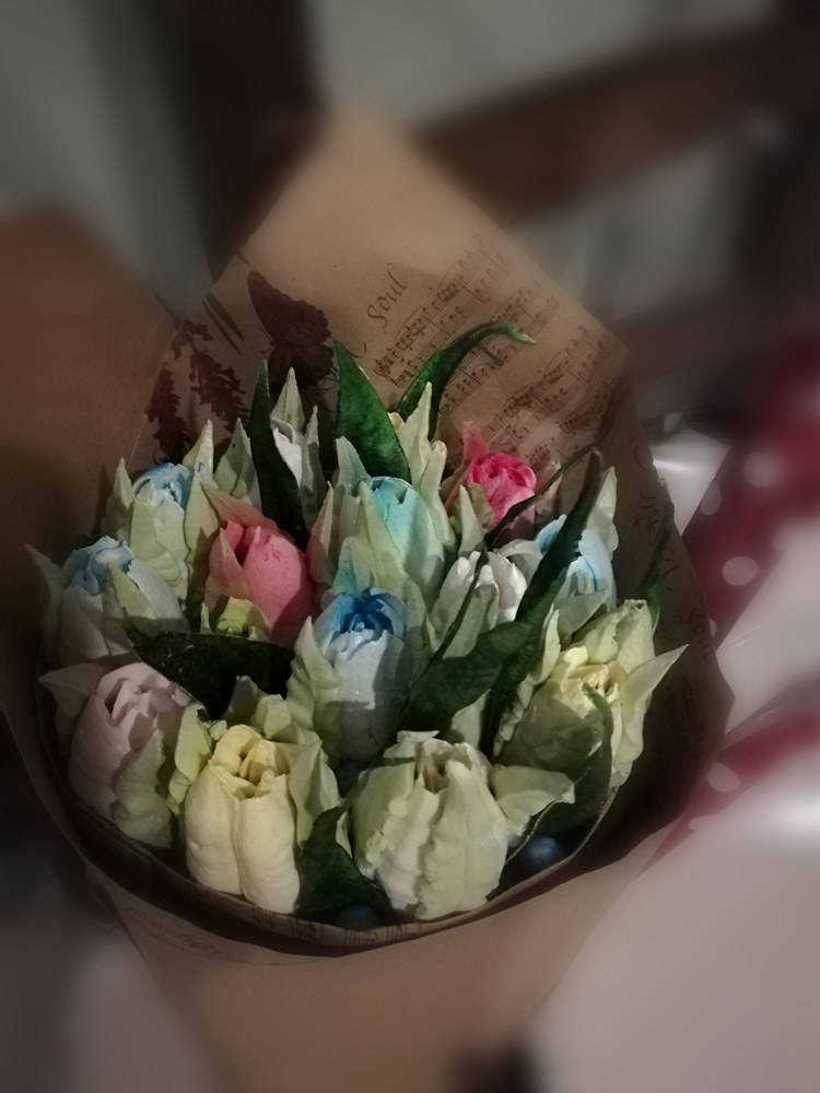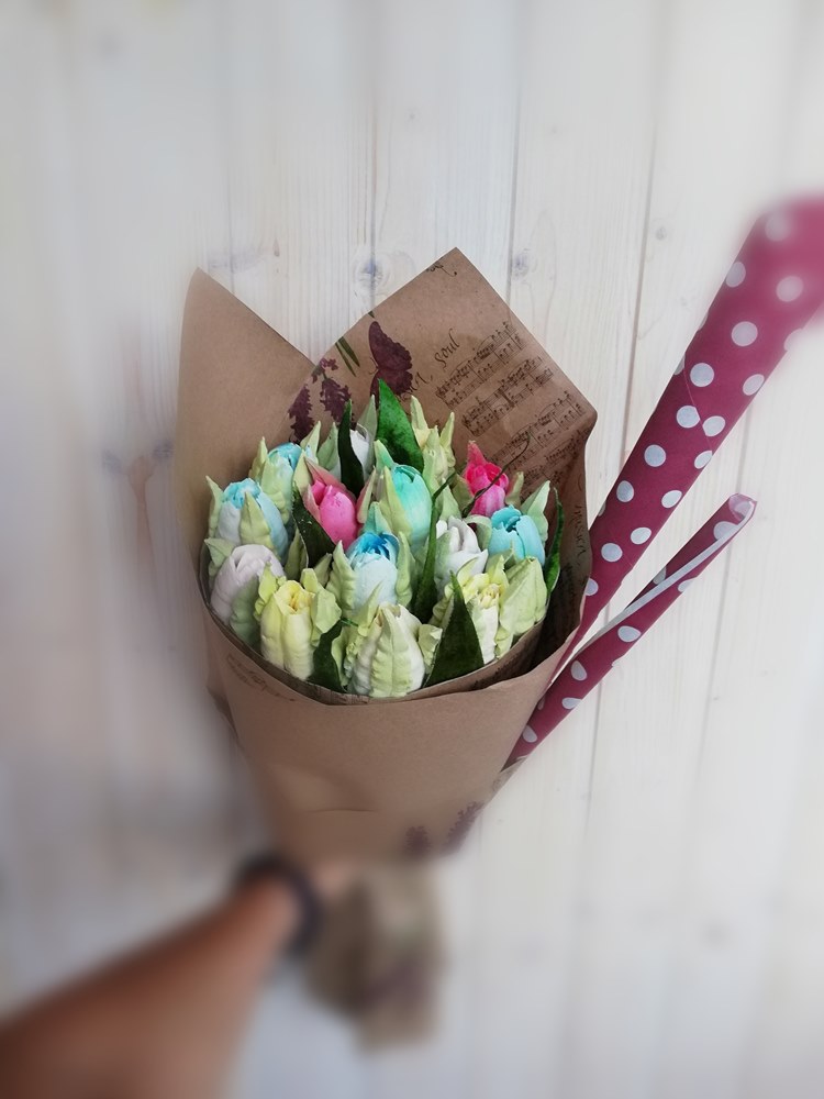 Букет моно, из 11−13 тюльпанов. Диаметр основания 16−18 см.