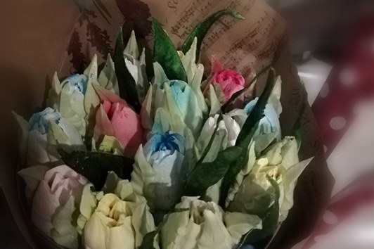 Яркий букет с летними розами. Диаметр основания 22-24 см.