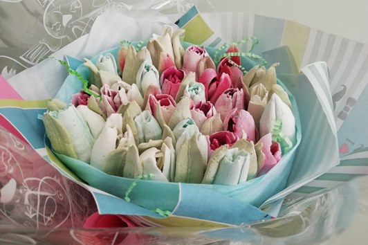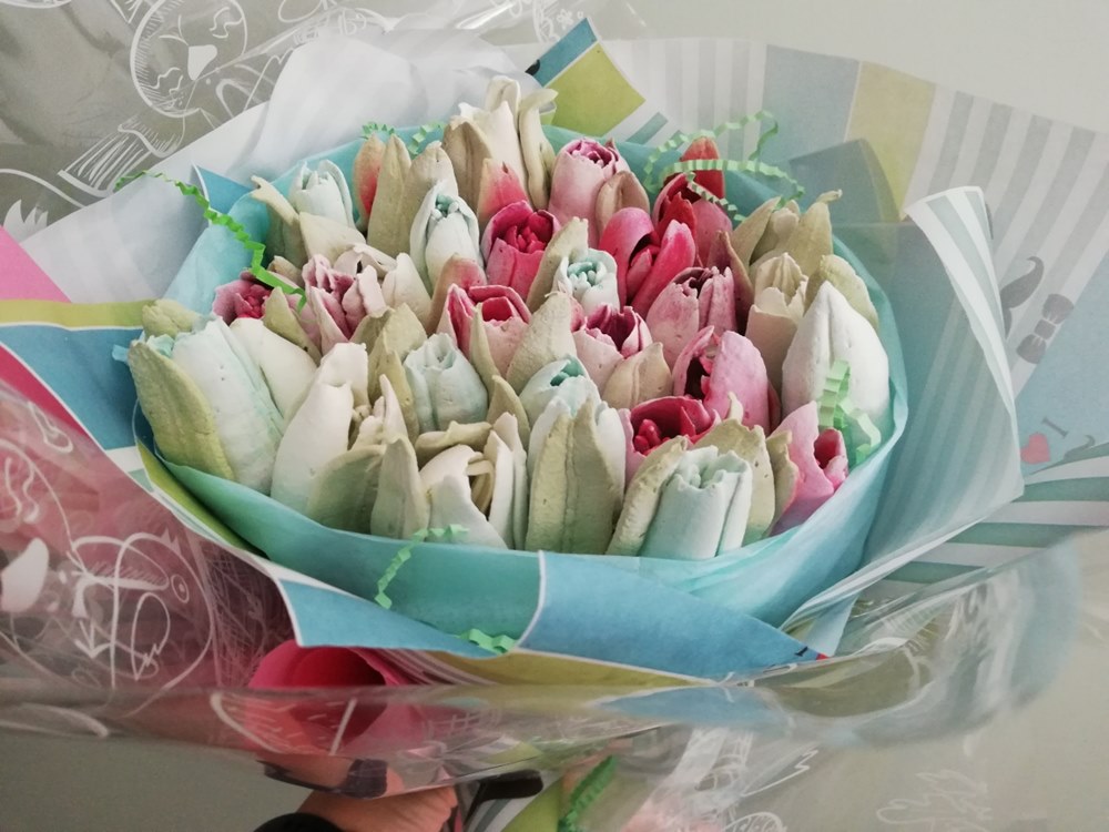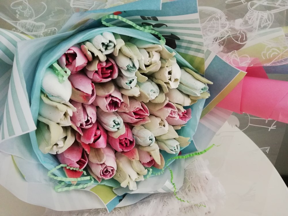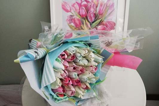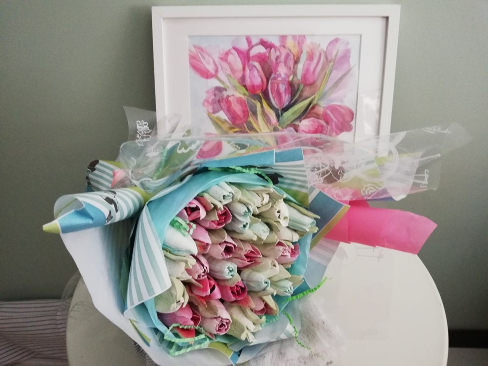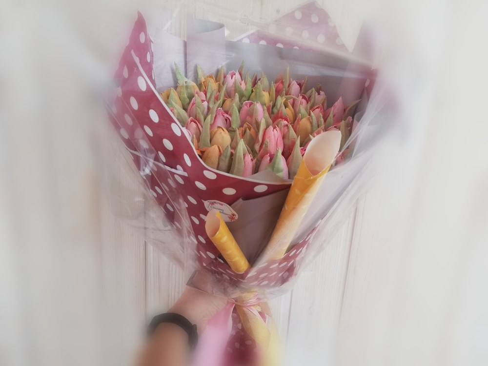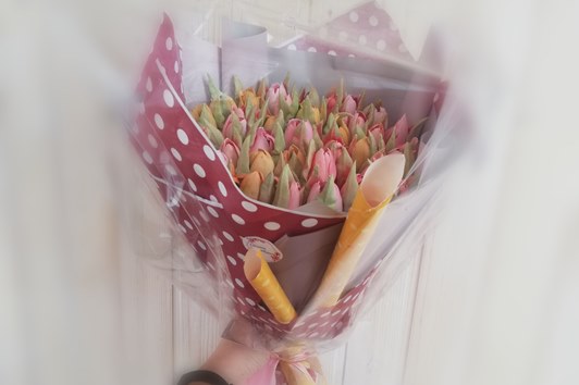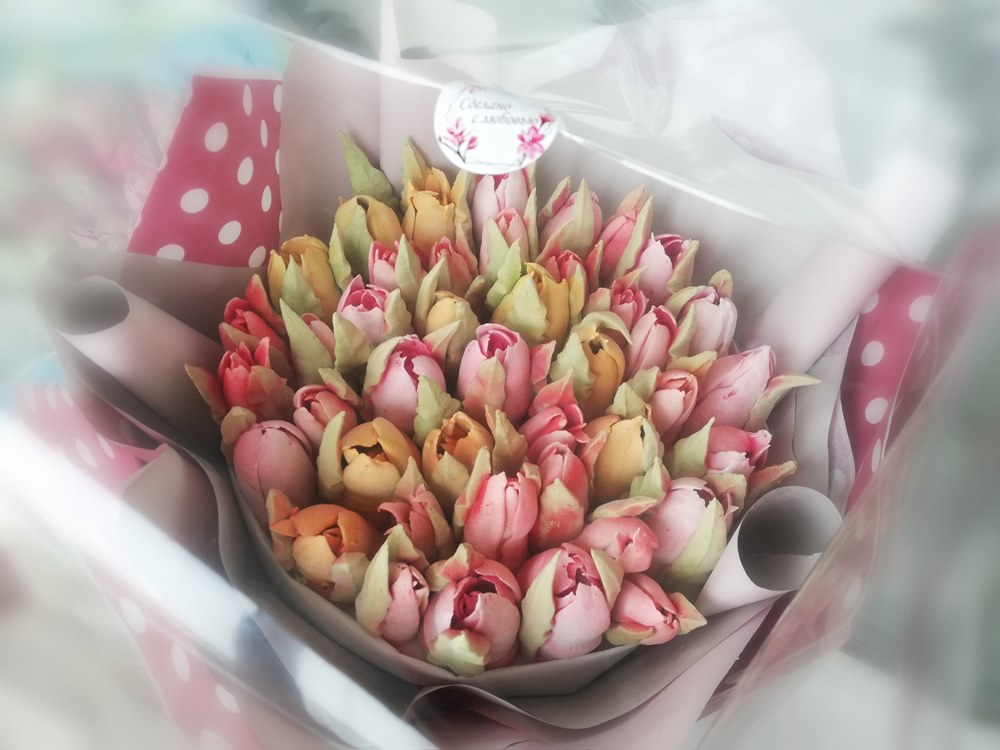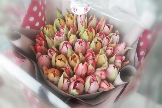 Букет моно, из 19−21 крупных и 7−11 мелких тюльпанов. Может быть выполнен в теплой или холодной цветовой гаммею