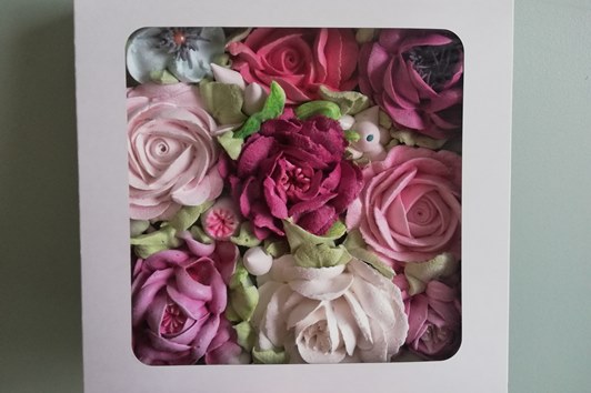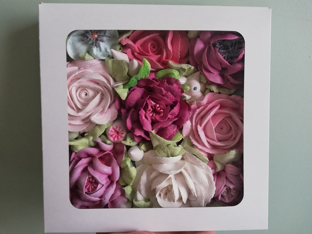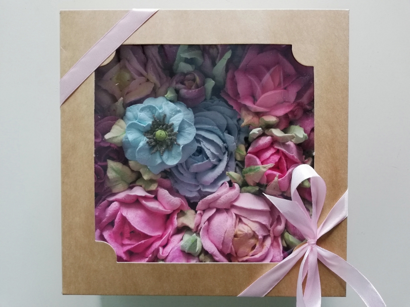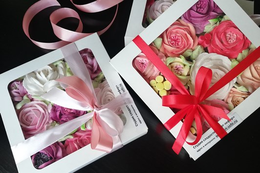 Самая элегантная коробочка, украшена атласными лентами с бантом, один слой зефирных цветов. Вес коробочки около 450 г. Самый востребованный подарок.