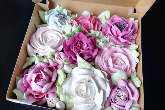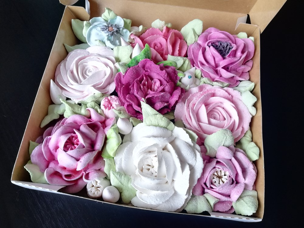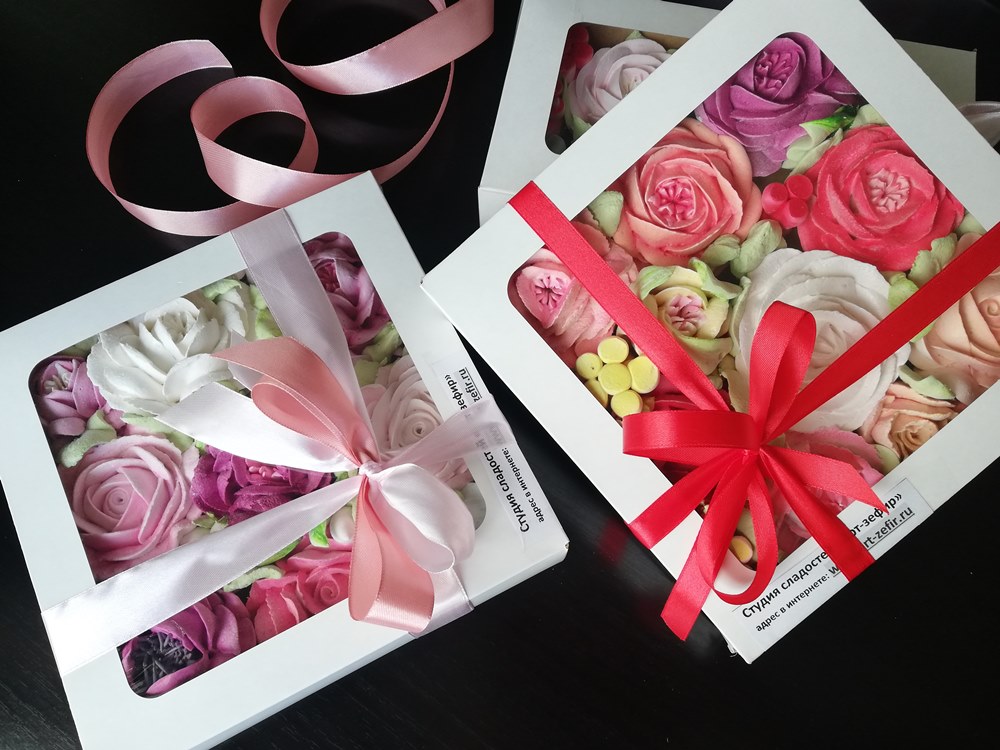 Изящный и практичный подарок для любителей зефира. Вес около 1 кг! А большому куску и сердце радо! Разные виды цветов. Коробочка украшена лентами.